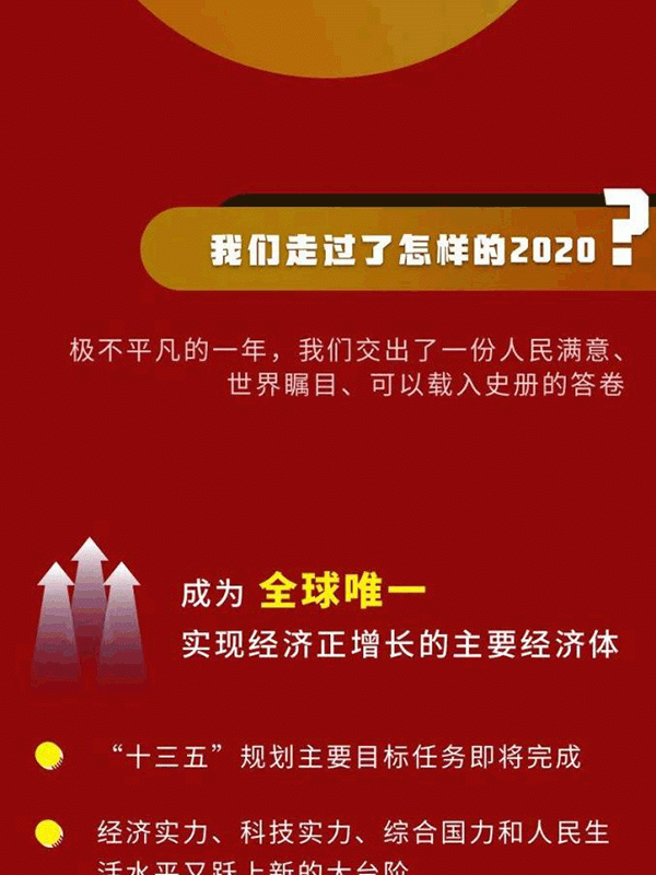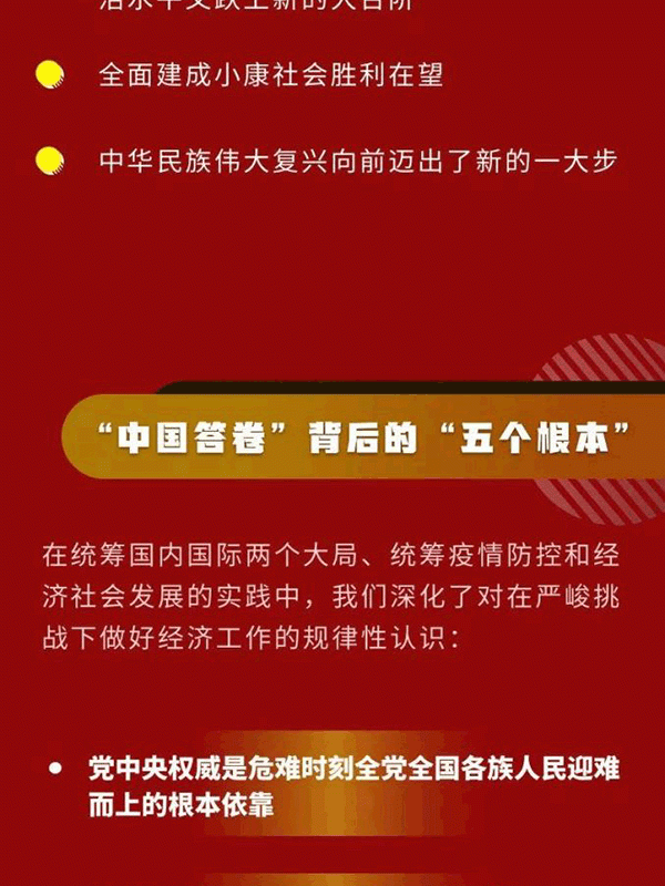 會議認(rèn)為,今年是新中國歷史上極不平凡的一年。面對嚴(yán)峻復(fù)雜的國際形勢、艱巨繁重的國內(nèi)改革發(fā)展穩(wěn)定任務(wù)特別是新冠肺炎疫情的嚴(yán)重沖擊,我們保持戰(zhàn)略定力,準(zhǔn)確判斷形勢,精心謀劃部署,果斷采取行動,付出艱苦努力,交出了一份人民滿意、世界矚目、可以載入史冊的答卷。我國成為全球唯一實(shí)現(xiàn)經(jīng)濟(jì)正增長的主要經(jīng)濟(jì)體,三大攻堅戰(zhàn)取得決定性成就,科技創(chuàng)新取得重大進(jìn)展,改革開放實(shí)現(xiàn)重要突破,民生得到有力保障。這些成績來之不易,歷經(jīng)艱難險阻,是以習(xí)近平同志為核心的黨中央堅強(qiáng)領(lǐng)導(dǎo)的結(jié)果,是全黨全軍全國各族人民團(tuán)結(jié)奮戰(zhàn)的結(jié)果。