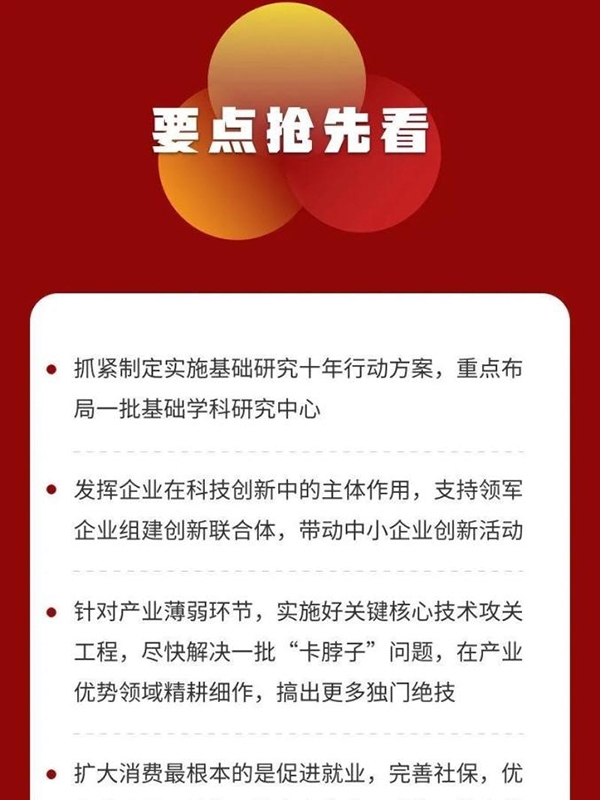 一是強(qiáng)化國家戰(zhàn)略科技力量。要充分發(fā)揮國家作為重大科技創(chuàng)新組織者的作用,堅持戰(zhàn)略性需求導(dǎo)向,確定科技創(chuàng)新方向和重點(diǎn),著力解決制約國家發(fā)展和安全的重大難題。要發(fā)揮新型舉國體制優(yōu)勢,發(fā)揮好重要院所高校國家隊作用,推動科研力量優(yōu)化配置和資源共享。要抓緊制定實(shí)施基礎(chǔ)研究十年行動方案,重點(diǎn)布局一批基礎(chǔ)學(xué)科研究中心,支持有條件的地方建設(shè)國際和區(qū)域科技創(chuàng)新中心。要發(fā)揮企業(yè)在科技創(chuàng)新中的主體作用,支持領(lǐng)軍企業(yè)組建創(chuàng)新聯(lián)合體,帶動中小企業(yè)創(chuàng)新活動。要加強(qiáng)國際科技交流合作。要加快國內(nèi)人才培養(yǎng),使更多青年優(yōu)秀人才脫穎而出。要完善激勵機(jī)制和科技評價機(jī)制,落實(shí)好攻關(guān)任務(wù)“揭榜掛帥”等機(jī)制。要規(guī)范科技倫理,樹立良好學(xué)風(fēng)和作風(fēng),引導(dǎo)科研人員專心致志、扎實(shí)進(jìn)取。