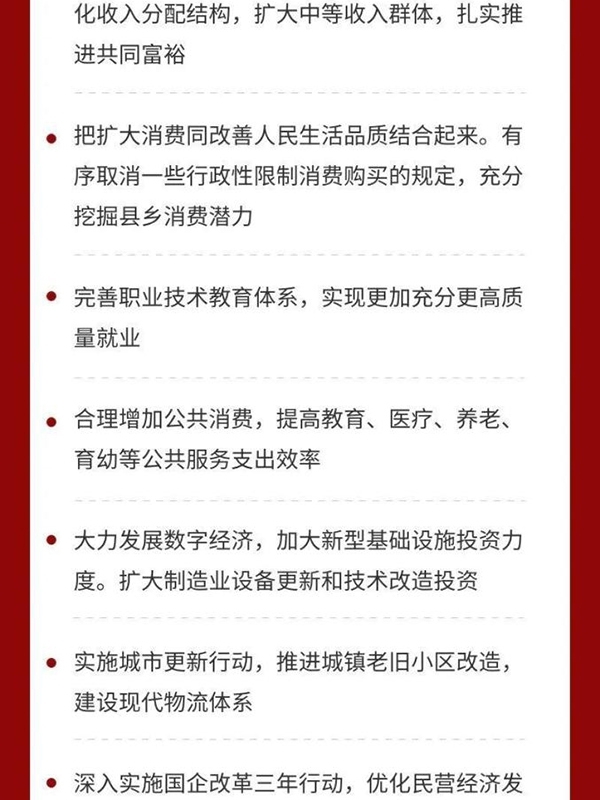 三是堅持?jǐn)U大內(nèi)需這個戰(zhàn)略基點(diǎn)。形成強(qiáng)大國內(nèi)市場是構(gòu)建新發(fā)展格局的重要支撐,必須在合理引導(dǎo)消費(fèi)、儲蓄、投資等方面進(jìn)行有效制度安排。擴(kuò)大消費(fèi)最根本的是促進(jìn)就業(yè),完善社保,優(yōu)化收入分配結(jié)構(gòu),擴(kuò)大中等收入群體,扎實(shí)推進(jìn)共同富裕。要把擴(kuò)大消費(fèi)同改善人民生活品質(zhì)結(jié)合起來。有序取消一些行政性限制消費(fèi)購買的規(guī)定,充分挖掘縣鄉(xiāng)消費(fèi)潛力。要完善職業(yè)技術(shù)教育體系,實(shí)現(xiàn)更加充分更高質(zhì)量就業(yè)。要合理增加公共消費(fèi),提高教育、醫(yī)療、養(yǎng)老、育幼等公共服務(wù)支出效率。要增強(qiáng)投資增長后勁,繼續(xù)發(fā)揮關(guān)鍵作用。要發(fā)揮中央預(yù)算內(nèi)投資在外溢性強(qiáng)、社會效益高領(lǐng)域的引導(dǎo)和撬動作用。激發(fā)全社會投資活力。要大力發(fā)展數(shù)字經(jīng)濟(jì),加大新型基礎(chǔ)設(shè)施投資力度。要擴(kuò)大制造業(yè)設(shè)備更新和技術(shù)改造投資。要實(shí)施城市更新行動,推進(jìn)城鎮(zhèn)老舊小區(qū)改造,建設(shè)現(xiàn)代物流體系。要加強(qiáng)統(tǒng)一規(guī)劃和宏觀指導(dǎo),統(tǒng)籌好產(chǎn)業(yè)布局,避免新興產(chǎn)業(yè)重復(fù)建設(shè)。