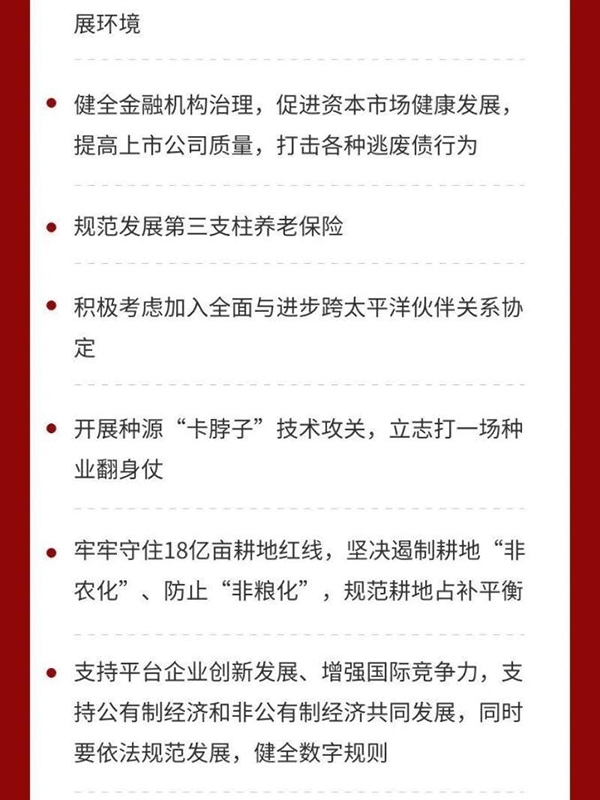 四是全面推進(jìn)改革開放。構(gòu)建新發(fā)展格局,必須構(gòu)建高水平社會主義市場經(jīng)濟(jì)體制,實(shí)行高水平對外開放,推動改革和開放相互促進(jìn)。要完善宏觀經(jīng)濟(jì)治理,加強(qiáng)國際宏觀政策協(xié)調(diào)。要深入實(shí)施國企改革三年行動,優(yōu)化民營經(jīng)濟(jì)發(fā)展環(huán)境,健全現(xiàn)代企業(yè)制度,完善公司治理,激發(fā)各類市場主體活力。要放寬市場準(zhǔn)入,促進(jìn)公平競爭,保護(hù)知識產(chǎn)權(quán),建設(shè)統(tǒng)一大市場,營造市場化、法治化、國際化營商環(huán)境。要健全金融機(jī)構(gòu)治理,促進(jìn)資本市場健康發(fā)展,提高上市公司質(zhì)量,打擊各種逃廢債行為。要規(guī)范發(fā)展第三支柱養(yǎng)老保險。要積極考慮加入全面與進(jìn)步跨太平洋伙伴關(guān)系協(xié)定。要大力提升國內(nèi)監(jiān)管能力和水平,完善安全審查機(jī)制,重視運(yùn)用國際通行規(guī)則維護(hù)國家安全。