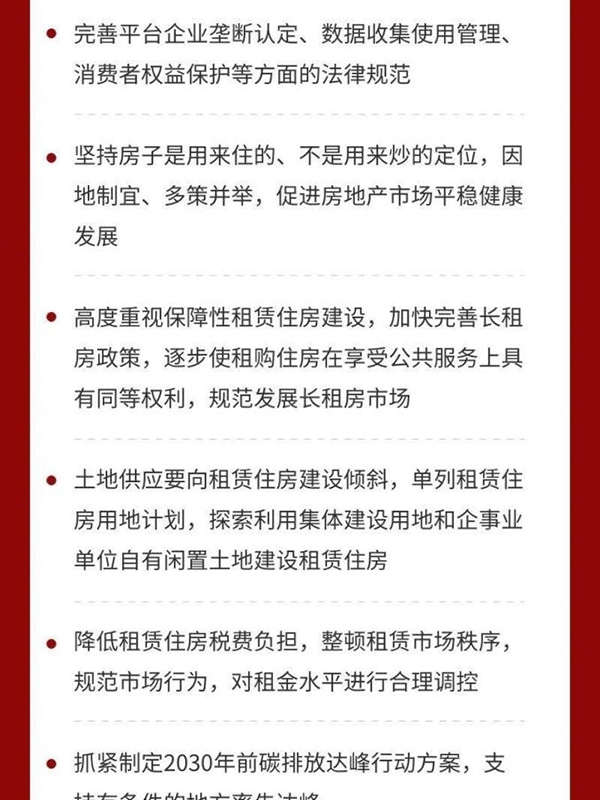 七是解決好大城市住房突出問題。住房問題關(guān)系民生福祉。要堅持房子是用來住的、不是用來炒的定位,因地制宜、多策并舉,促進(jìn)房地產(chǎn)市場平穩(wěn)健康發(fā)展。要高度重視保障性租賃住房建設(shè),加快完善長租房政策,逐步使租購住房在享受公共服務(wù)上具有同等權(quán)利,規(guī)范發(fā)展長租房市場。土地供應(yīng)要向租賃住房建設(shè)傾斜,單列租賃住房用地計劃,探索利用集體建設(shè)用地和企事業(yè)單位自有閑置土地建設(shè)租賃住房,國有和民營企業(yè)都要發(fā)揮功能作用。要降低租賃住房稅費(fèi)負(fù)擔(dān),整頓租賃市場秩序,規(guī)范市場行為,對租金水平進(jìn)行合理調(diào)控。
