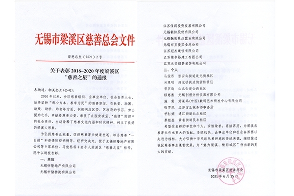 此次無錫市梁溪區(qū)慈善總會(huì)為表彰2016至2020年間,在扶貧、助困、助殘、助學(xué)、助老、“疫情”防控中做出貢獻(xiàn)的單位及個(gè)人授予梁溪區(qū)“慈善之星”稱號(hào),以通報(bào)表彰。創(chuàng)想儀器顧惠惠女士有幸得此殊榮,作為一名企業(yè)領(lǐng)導(dǎo)人,在“疫情”防控中奉獻(xiàn)自己的力量是應(yīng)盡的責(zé)任。我們將珍惜榮譽(yù),再接再厲,為梁溪慈善事業(yè)作出更大的貢獻(xiàn)。