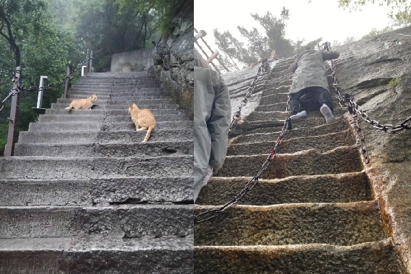 上至西峰處開(kāi)始,要走階梯了,因?yàn)橛晁?,路面有些濕滑,路過(guò)三圣母廟,斧劈石,因沉香劈山救母?jìng)髡f(shuō)而得名。