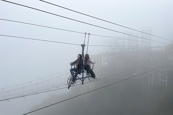 因為在云端,有云有霧實在太正常了,讓我拍出來的照片,都帶了層層的天然濾鏡。小伙伴們都去找項目玩上了:在“‘懸崖秋千’,驚聲尖叫”、“‘水晶廊橋’,一步一趨”、“‘凌空飛步’,顫抖蹦跳”、“‘云中漫道’,站立云端”、“空中自行車”、“彩虹滑草”、“軌道滑草”、“射箭”、“射擊”、“卡丁車”等等多項活動,讓人流連忘返。我們一起來看。